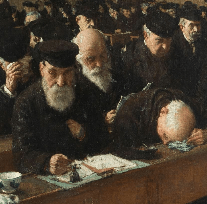 All’interno di uno dei grandi locali del Pio Albergo Trivulzio di Milano molti anziani sono seduti su panche disposte su file ordinate. Ogni anziano è rappresentato con un particolare atteggiamento. Qualche ospite posa la testa sul banco e dorme, qualcun altro poi sembra pregare. Alcuni, invece, leggono mentre altri osservano intorno. Gli ospiti sono tutti vestiti con abiti e cappelli neri.
