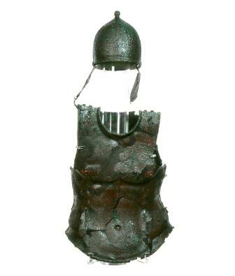 Fig. 3 Corredo della Tomba dei due guerrieri-Corazza anatomica ed elmo a bottone di tipo Montefortino IIIsec a.C. da Lavello, Melfi Museo A.N. del Melfese M. Pallottino