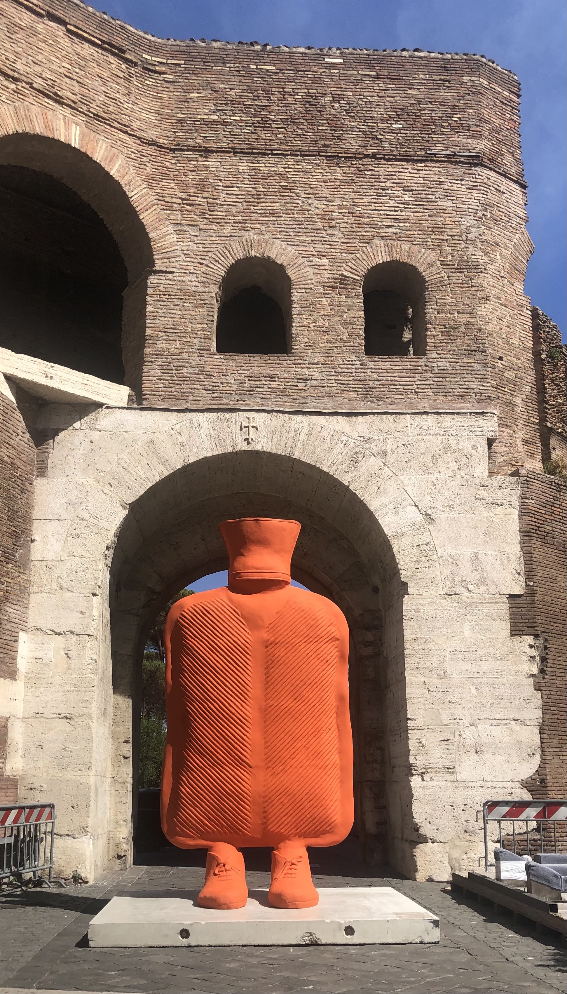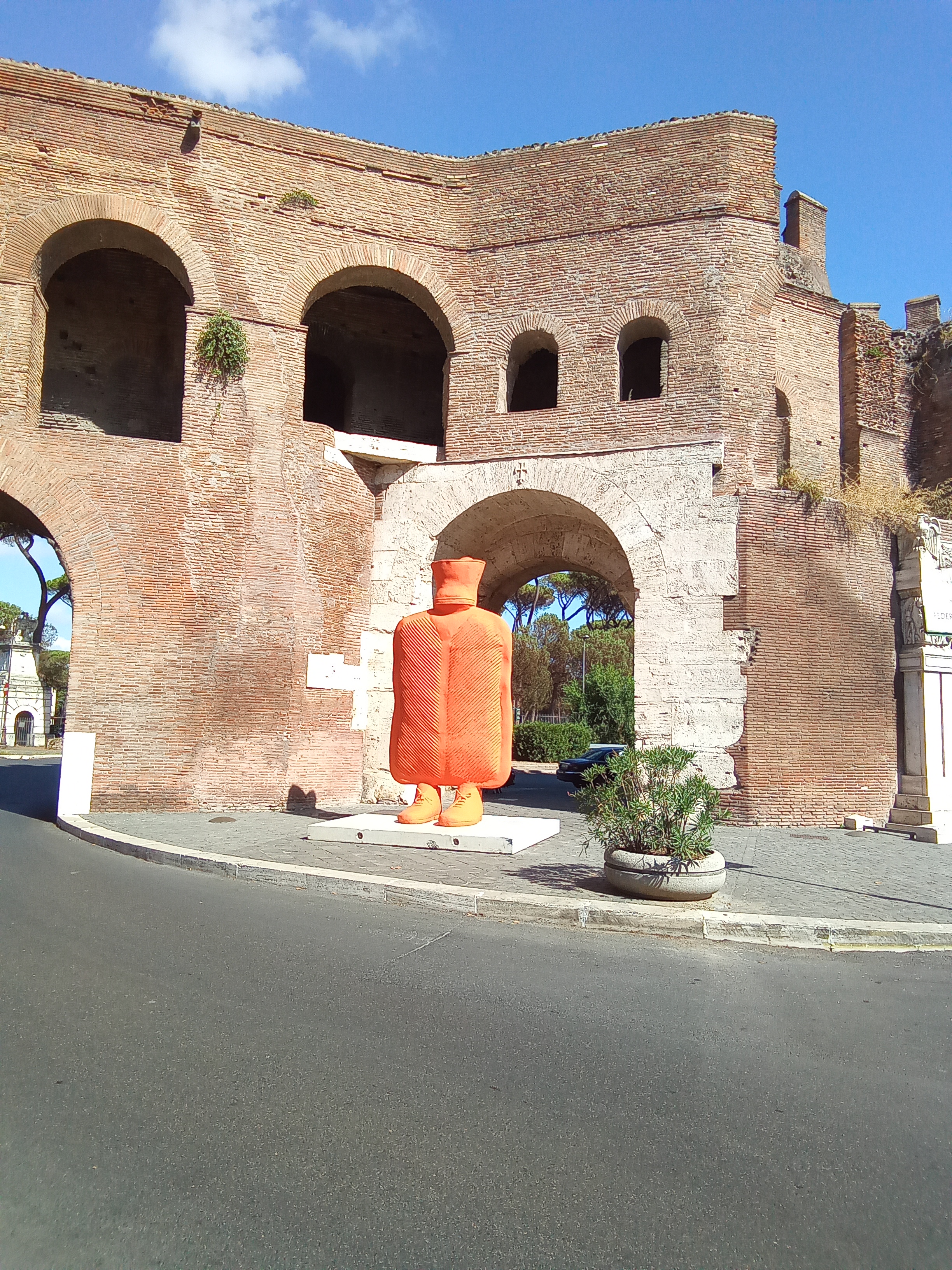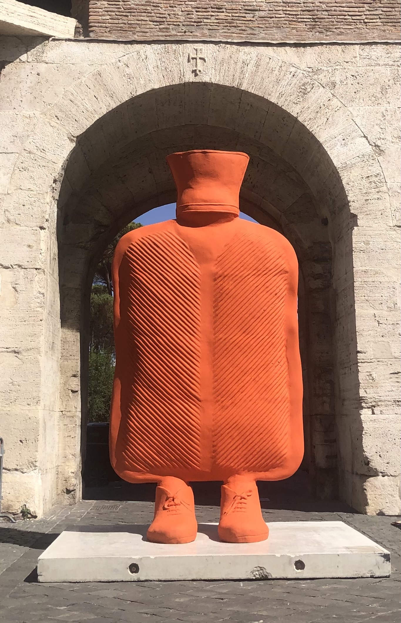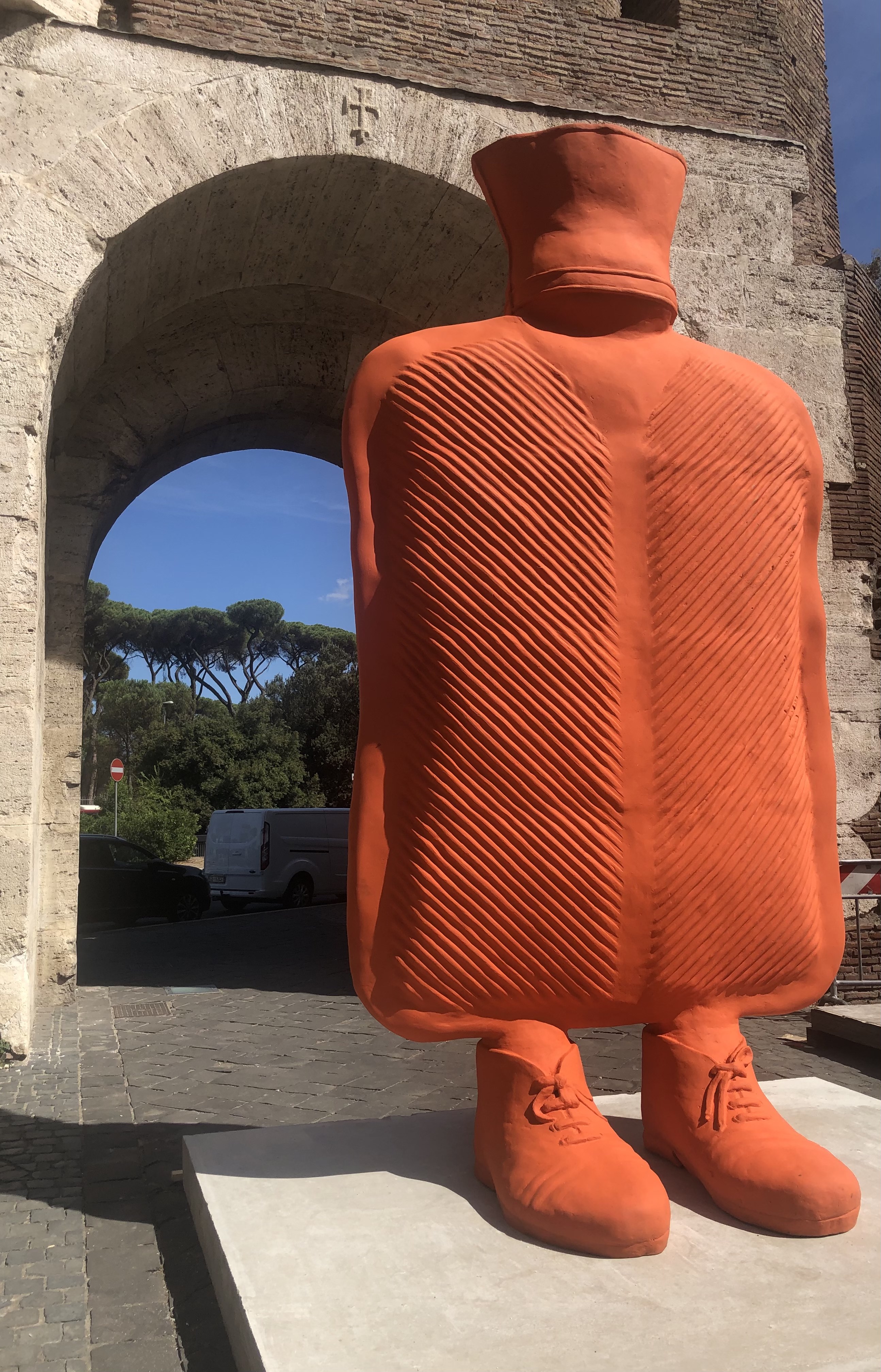 Nel percorso, alcune opere iconiche dell’artista. Ecco allora, incorniciata dall’arco di Porta Pinciana, Big Mutter (2015), borsa dell’acqua calda di grandi dimensioni che si regge sulle proprie gambe, omaggio a cura e affetto che le madri dimostrano per i propri figli. Ed ecco Boot, Butter e Boxing Glove (2015-16) nella serie delle Performative Sculptures. Poi, le Sculture Tascabili, serie di borse e valigie su gambe (2017-21). Di opera in opera, ad essere raccontate sono ricerca e filosofia dell’artista, indagate però anche in relazione al luogo e al momento. Così, ad esempio, contemplando Fat House (2003) tornano alla mente eccessi e golosità del cinema felliniano, ma è inevitabile pensare pure al significato di casa, specie in epoca di pandemia, e, ovviamente, al messaggio insito nell’opera che si fa vivace critica alla nostra ossessione per la dieta e per la magrezza.