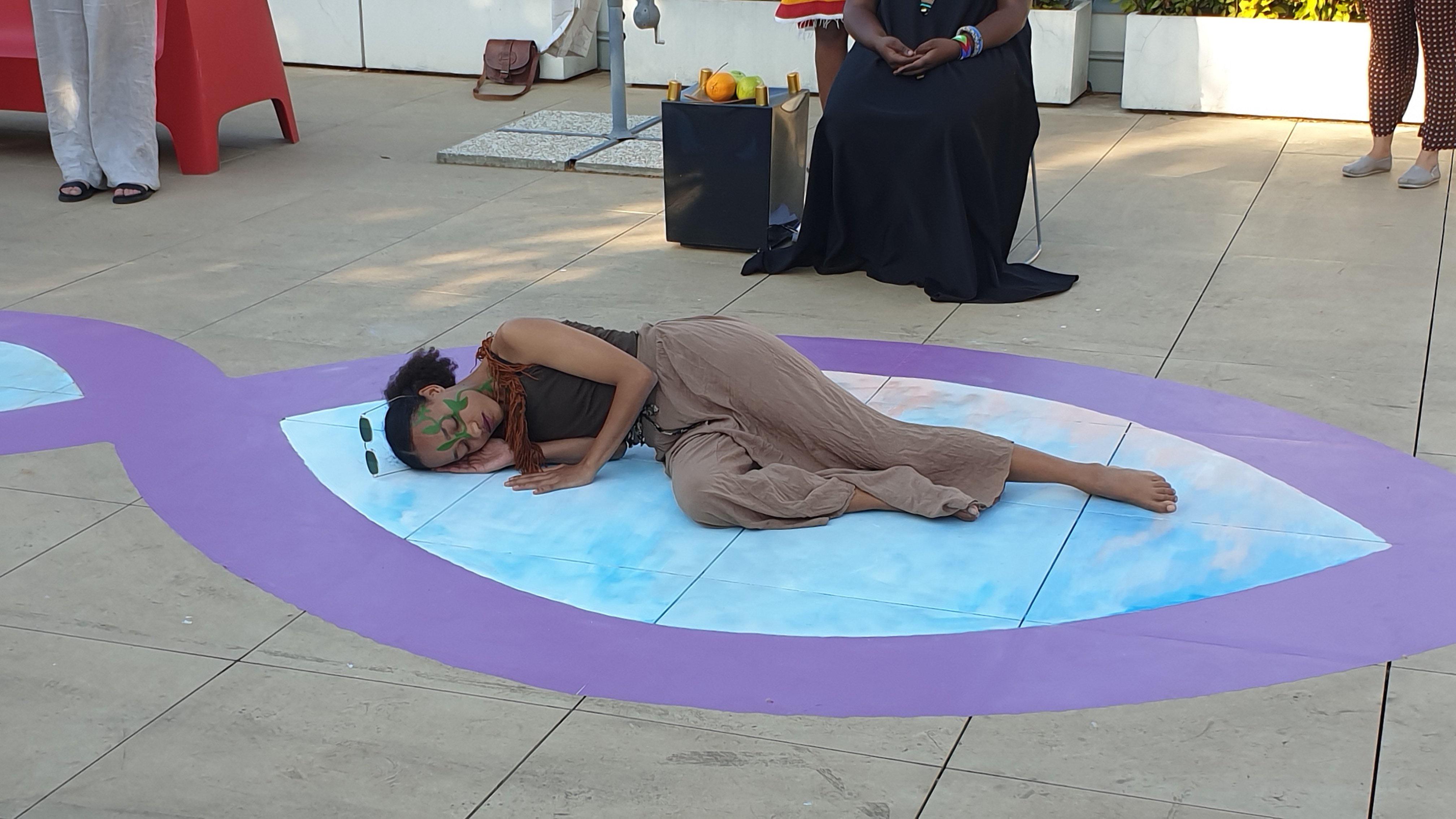 L’opera realizzata con la collaborazione di 20 giovani artisti, provenienti dall’Africa e dall’Europa, del progetto ARTXCHANGE, grazie ad un programma di COOPCulture e CISP Comitato Internazionale per lo Sviluppo dei Popoli, è stata accompagnata da una performance di giovani con danze e musiche che hanno riportato gli spettatori in un tempo e uno spazio naturale pur trovandosi sulla terrazza di uno dei più bei palazzi di Roma.