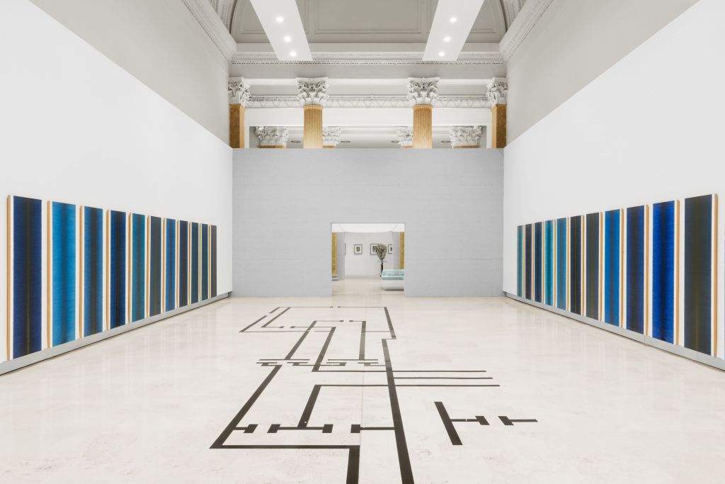 Il lavoro scelto per la mostra, Bleu Carnac (1992) indagava il segno nel suo senso pre-linguistico, mettendo in atto l’esplorazione fisica della scrittura non secondo la semiotica e autoreferenziale, ma dispiegandosi in segni che provocano una sorta di trance. Le 38 tele, infatti, formavano un corridoio pulsante e ipnotico che rievocava gli allineamenti megalitici di Carnac in Bretagna, un percorso sacro scandito da un ritmo creato dal colore e dalle pause. Ciascun esemplare della serie era stato dipinto dall’artista in assoluto silenzio, partendo dal centro della tela e facendo coincidere ogni pennellata con un respiro.