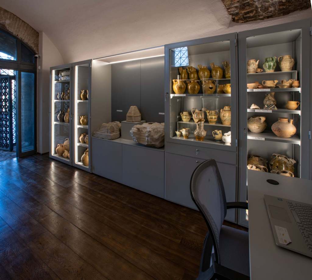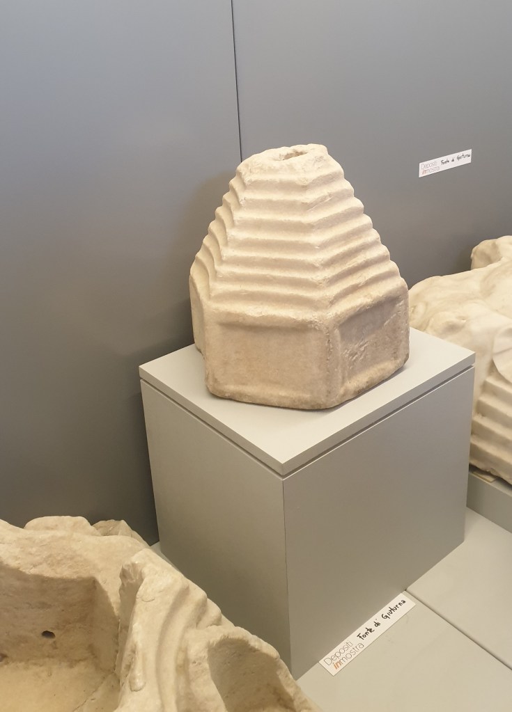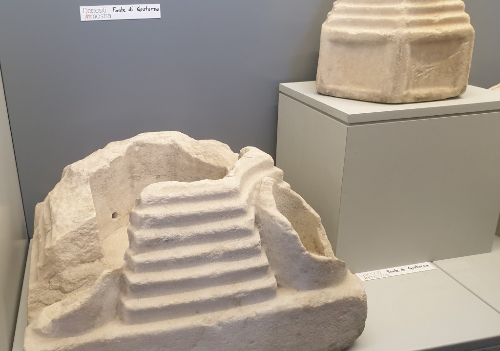 La terza e ultima sala ospita i reperti di epoca medievale, vasi di IX-X sec.d.C. rinvenuti dalla Fonte di Giuturna, una monumentale vasca, fontana di epoca protostorica, dove, secondo l’Eneide Rea Silvia va a prendere l’acqua scendendo dal Palatino di notte (le vestali potevano uscire dal recinto solo dopo il tramonto) nell’angolo nord-ovest del Foro e lì incontrerà Marte con cui genererà i gemelli. Una fonte di grandissima importanza che recepiva una polla d’acqua minerale di lunghissima vita fino all’epoca alto medievale, durante la quale viene abbandonata, riversando dentro una quantità considerevole di vasellame per riempirla, proprio lì accanto verrà costruita la Chiesa di Santa Maria Antiqua, testimoniando la frequentazione del Foro in quell’epoca. Con il ritrovamento di vasellame si è ipotizzata l’esistenza di una manifattura per la produzione di ceramica invetriata, si tratta di boccali di colore verde oliva, ma anche olle acquarie e boccalini in ceramica comune da dispensa. Modelli in pietra e ceramica di fontane votive dedicate a Giuturna e alla sua fonte sono esposti lì accanto. In questo ultimo spazio ci sono anche ceramiche più tarde XI e XII sec. d.C. e maioliche dal XII e XIV e XV sec.d.C. che testimoniano la continuità dell’uso e il passaggio dall’epoca antica a quella moderna.