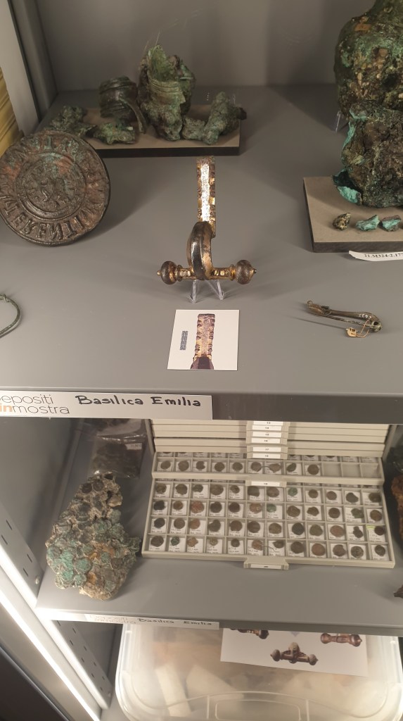 Altri reperti provengono dalle indagini di scavo nella Basilica Emilia, un edificio che subì vari incendi, tra cui uno che è stato possibile datare alla seconda metà del III sec., grazie al ritrovamento di monete al di sotto del pavimento cementato, oltre ad altri oggetti e arredi funzionali all’edificio, nel quale si amministrava la giustizia. L’edificio finirà abbandonato, sopra di esso si costituiranno in epoca medievale, una serie di abitazioni e nel 1500 nascerà il quartiere Alessandrino, poi raso al suolo alla fine dell’800 per avviare gli scavi. Reperti del periodo medievale, come lingotti di piombo, asce in ferro, un paiolo, oggetti del camino, hanno fatto ipotizzare l’esistenza di una manifattura per il lavoro del metallo in età alto medievale.