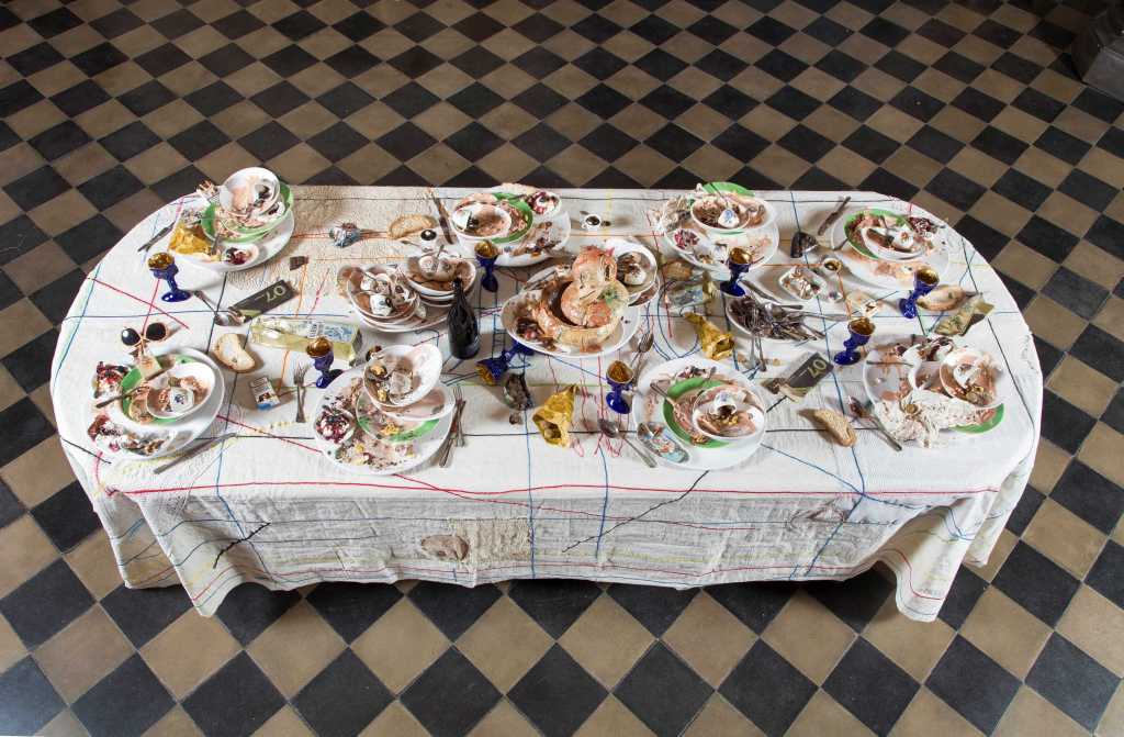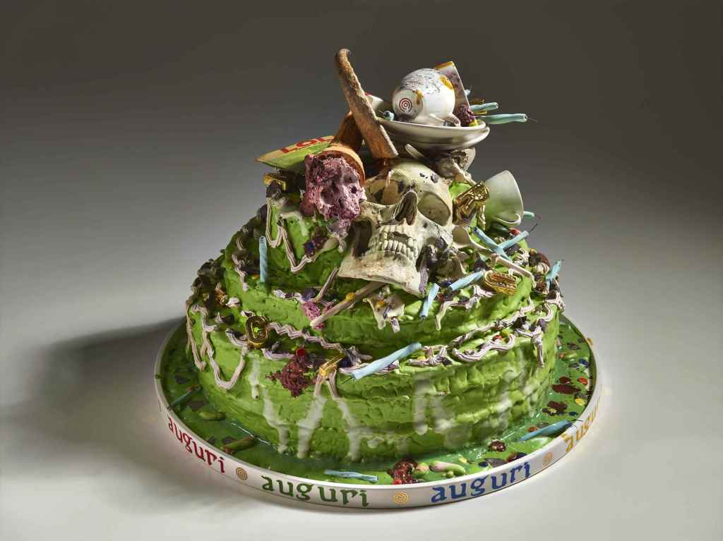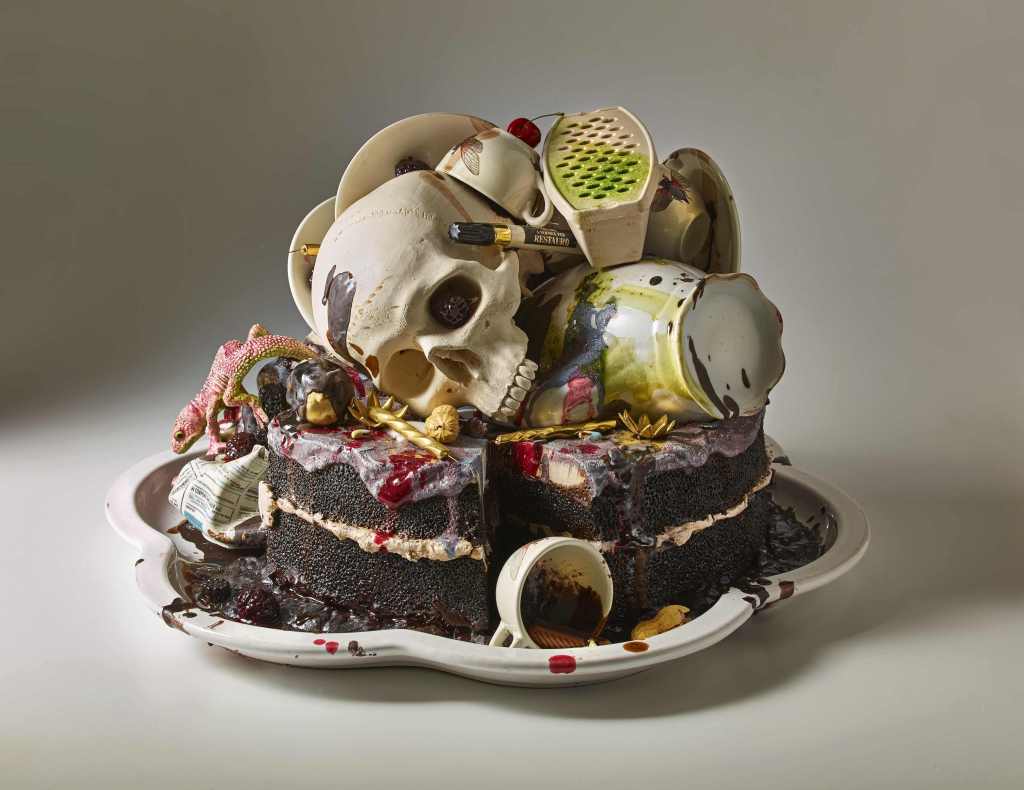 Il suo sguardo benevolo, se pur turbante, è un lasciapassare per accedere alla sala principale di CARLOCINQUE Gallery, abitata da una significativa selezione della più recente produzione di Bertozzi&Casoni.È un viaggio nella natura e nel più spettacolare artificio accompagnati da ironia, spirito provocatorio, gusto di stupire, ma anche dal rigore di analisi e sottende l’invito a riflettere sui grandi temi della società contemporanea e sull’eterna condizione di transitorietà della condizione umana. La stupefacente perfezione tecnica esibita dai due artisti accarezza l’illusione della realtà svelando brani di vita quotidiana, ipertrofici accumuli ricchi di dettagli, generose citazioni tratte direttamente dalle discariche. Le loro creazioni riconducono al tema classico della Vanitas, fin dalle origini del loro operato il duo Bertozzi&Casoni ha infatti ragionato sulla caducità dell’esistenza. Eppure l’esuberanza della loro immaginazione strappa un sorriso, mostra il divertimento del gioco combinatorio e la favola dell’oggetto prezioso fatto di residui. Sospendiamo la nostra incredulità di fronte ai detriti di vizi e virtù, agli avanzi di feste finite, a ciò che resta delle leccornie del giorno prima tra cui si insinuano infinite presenze di animali e vegetali (lucertole, lumache, farfalle, uccelli, coccinelle, fiori, funghi…). Si fa strada la struggente sensazione che ogni giorno si costruisce e si distrugge, mentre il mondo naturale resiste e assiste alla nostra ambivalenza.E su tutto domina la bellezza dell’artificio e della perfezione: uno stupore che tintinna anche sulla lattina arrugginita, sulla tazzina incrostata di caffè e sull’intera composizione. Non potremmo esserne ipnoticamente assorbiti se non fosse per la tecnica sopraffina con cui è offerta alla vista. Scegliere, come fa il duo imolese, per la realizzazione delle loro opere un materiale antichissimo quale è la ceramica può voler dire ribaltare il senso della Vanitas, dare in un certo senso eternità all’iconografia del transitorio. Un cortocircuito che si aziona con più forza quando la scelta del soggetto è di per sé un residuo dell’umano. Per questa forza persuasiva e illusoria della materia CARLOCINQUE gallery espone alcune sculture con accumuli di ossa umane, l’estrema traccia di vita che trova una infinita rinascita nell’arte. Gli artisti hanno affermato che la loro visione non è pessimistica, nei loro memento mori si trova sempre una speranza. Piccoli organismi viventi si depositano anche su cerei teschi e tibie.Bertozzi&Casoni sono consapevoli di creare nell’alveo della tradizione dell’arte, da quella classica a quella pop, con il chiaro intento di rinnovarla con originalità, spregiudicatezza e grazie a una forte vocazione per la sperimentazione. Tutto è possibile nella loro Wunderkammer dove spesso è ancora un animale – la scimmia, il più simile all’uomo – a suggerire l’ironia e a guidare verso lo stupore: senza riverenza un macaco ha rubato la tela della celeberrima “Ragazza con l’orecchino di perla”, mentre un’altra ha scelto per sé un semplice poster con l’immagine di Marilyn Monroe.