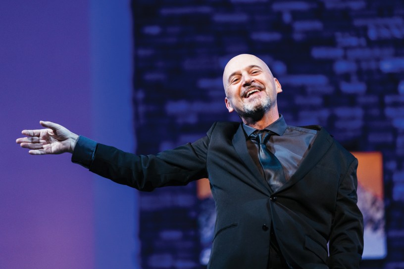 La versione dell’opera diretta dall’affermata regista ungherese Kriszta Székely con l’adattamento del testo di Armin Szabó-Székely, restituisce un dramma calato in una dimensione contemporanea, con un linguaggio che nell’adattamento riesce a fondere il basso con l’alto, attraverso parole che stregano, manipolano e sgomentano ma riescono a collocare la storia in un contesto qualsiasi di uno stato del mondo. Il racconto è universale, la trama racconta l’ascesa di un qualsiasi tiranno, uno di quelli così familiari a tutte le generazioni e a tutte le epoche, mostrandoci come oggi, attraverso la falsificazione delle notizie, la volgarità dei talk-show, il bombardamento mediatico apparentemente incontrollato, la gogna nei social, un uomo riesca a convincere un popolo e il suo entourage, riesca a trasformare la menzogna, l’inganno in una credenza, d’altronde senza fede, sottolinea lui stesso, il potere è perduto, non esiste. L’adattamento all’era digitale avvicina la scena alla platea e ci svela così i pericoli che incombono sulla nostra società, sulla politica che crediamo grandiosa e inarrivabile ed invece è nei fatti volgare e tutt’altro che elevata, soprattutto quando è affidata a personaggi ambigui che sono intimamente votati al male e alla brama di potere.