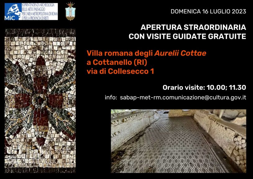 Anche per il 2023 tornano le aperture straordinarie della villa degli Aurelii Cottae a Cottanello (RI) con visite guidate gratuite e senza prenotazione, curate dai funzionari della Soprintendenza Archeologia, Belle Arti e Paesaggio per l’area metropolitana di Roma e per la provincia di Rieti in collaborazione con il Comune di Cottanello.