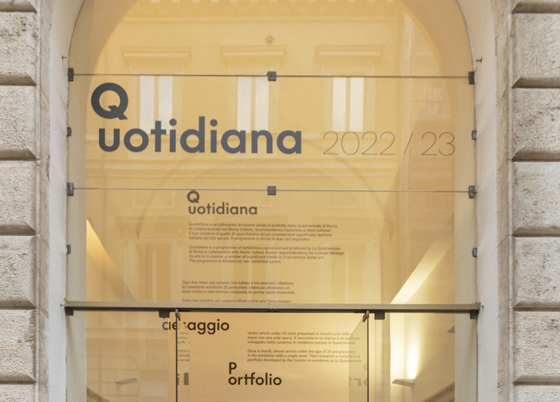 QUOTIDIANA è il programma espositivo che, a partire da settembre 2022, coinvolge le due sale al piano terra del Museo di Roma, aperte al pubblico con un palinsesto di mostre, ideate e prodotte dalla Quadriennale, con l’obiettivo di approfondire alcuni orientamenti significativi dell’arte italiana del XXI secolo. Nell’atrio d’ingresso che connette le due sale è allestito uno spazio di lettura dove sono messi a disposizione del pubblico i testi critici sviluppati dai curatori delle due rassegne. Il programma si divide in due cicli espositivi. In Paesaggio, ogni due mesi, curatori italiani e stranieri riflettono su traiettorie artistiche attraverso un testo critico e una mostra con poche opere essenziali. In Portfolio, ogni mese un artista under 35 è presentato in mostra con una sola opera. A raccontarne la ricerca è un portfolio sviluppato da Gaia Bobò, curatrice della Quadriennale