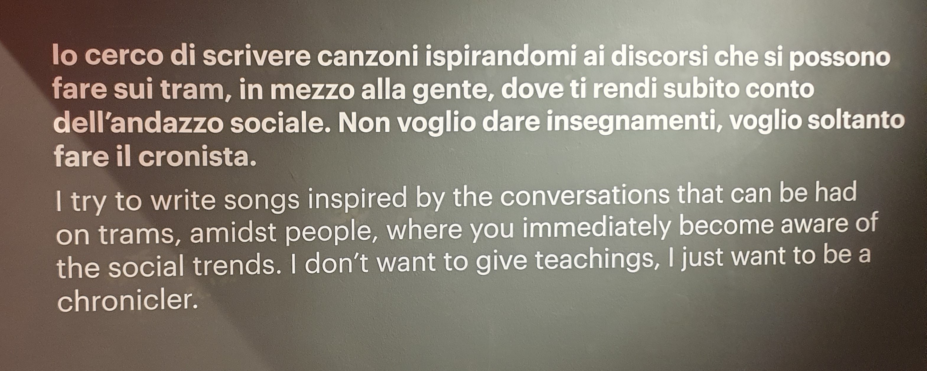 La mostra sarà corredata dal catalogo edito da Gangemi Editore che contiene storia, immagini e un lungo elenco di straordinarie testimonianze che aiutano a comprendere tutte le sfaccettature di un uomo considerato uno dei cantastorie di culto della nostra storia. Un viaggio straordinario di memoria collettiva al ritmo delle note delle sue stralunate canzoni e dove la sua arte sarà più viva che mai.