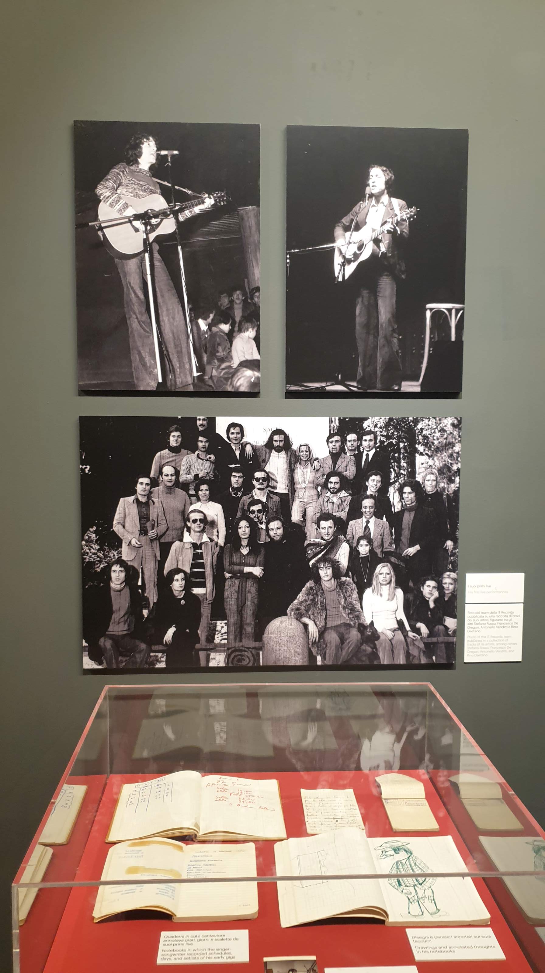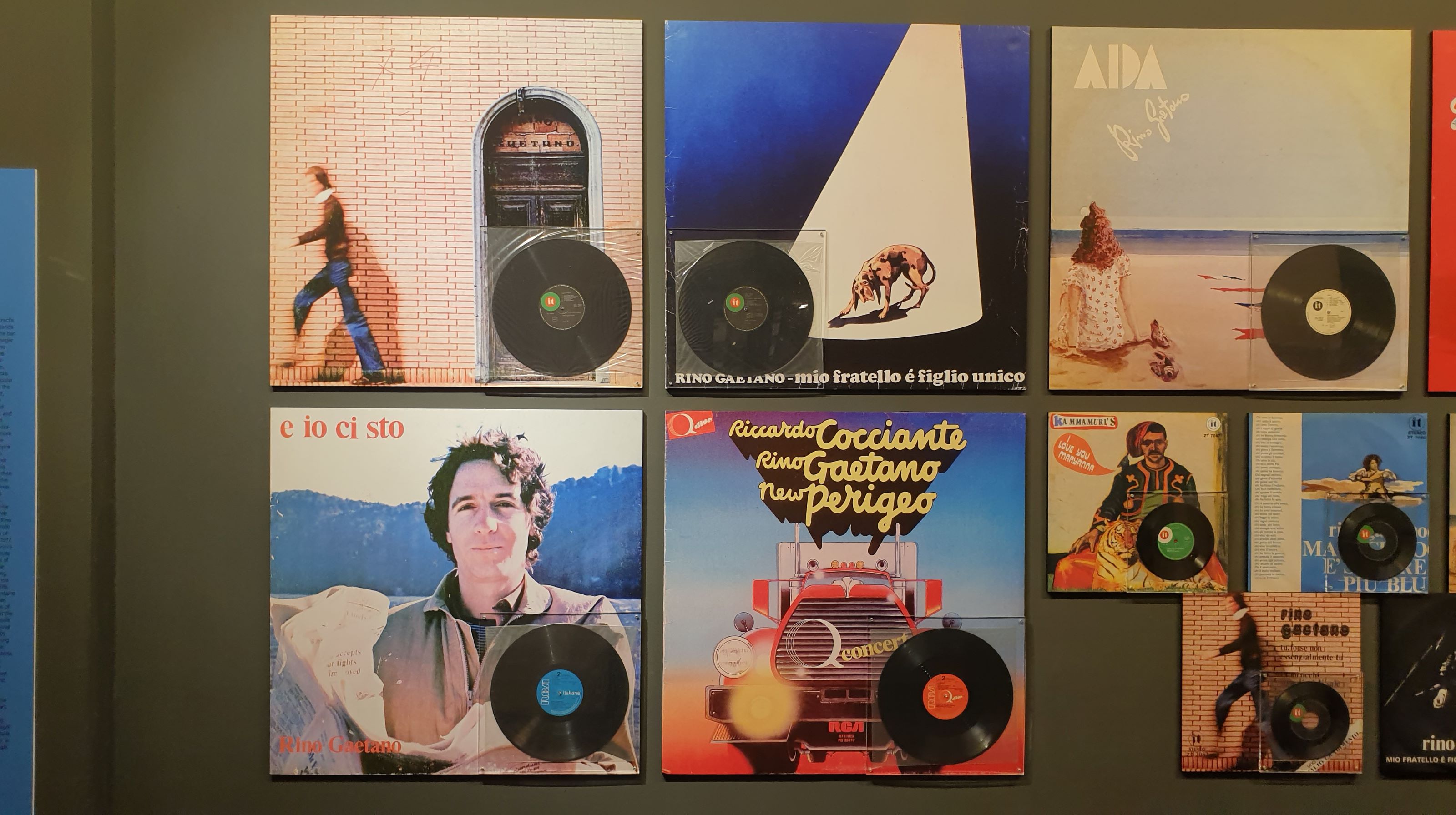 Molti i materiali inediti, esposti per la prima volta, che documentano l’intero cammino artistico di Rino Gaetano, con ‘tante rarità’, concesse per l’occasione dalla sorella Anna: documenti, foto, cimeli artistici, la raccolta dei dischi, video, strumenti musicali, oggetti, abiti di scena come l’accappatoio indossato durante il Festivalbar all’Arena di Verona e la giacca in pelle utilizzata a Sanremo, i manifesti, la collezione di cappelli.
