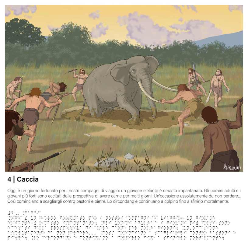 L’esposizione, collocata nel Giardino Pleistocenico, si compone di 15 pannelli con illustrazioni in rilievo e didascalie tradotte in Braille in cui sono rappresentate scene fantasiose, ma scientificamente accurate, che ritraggono momenti di quotidianità dei nostri antenati neandertaliani. Durante un’intera giornata fino al calare della notte, si segue la piccola comunità nomade, composta da uomini, donne e bambini, nei suoi spostamenti alla ricerca di cibo, ma non solo. Oltre alle attività di caccia e raccolta c’è spazio anche per il gioco, per momenti di convivialità attorno al fuoco e per l’amore.