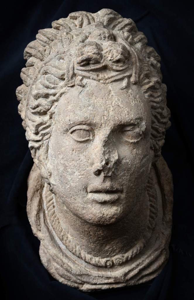 In mostra anche una splendida testa femminile in pietra lavica, in origine proveniente da Orvieto, oggi conservata al Museo di Scultura Antica Giovanni Barracco di Roma, caratterizzata dall’intensa espressione patetica che anima il volto, incorniciato da una complessa pettinatura con nastri e fermagli, da pendenti alle orecchie e da un girocollo. La scultura, realizzata pochi decenni prima della presa di Volsinii, ornava con ogni probabilità una delle porte della città etrusca.