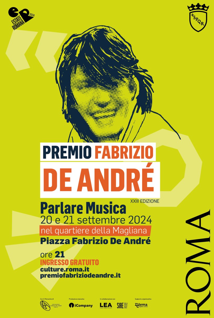 La 23ªedizione del “Premio Fabrizio De André – Parlare Musica” è patrocinata dalla Fondazione Fabrizio De André Onlus, promossa e sostenuta dall’Assessorato alla Cultura di Roma Capitale con il coordinamento del Dipartimento Attività Culturali, la produzione esecutiva di iCompany, la direzione artistica di Luisa Melis, il supporto organizzativo di Zétema Progetto Cultura e la collaborazione con Lea e Siae – Società Italiana degli Autori ed Editori.