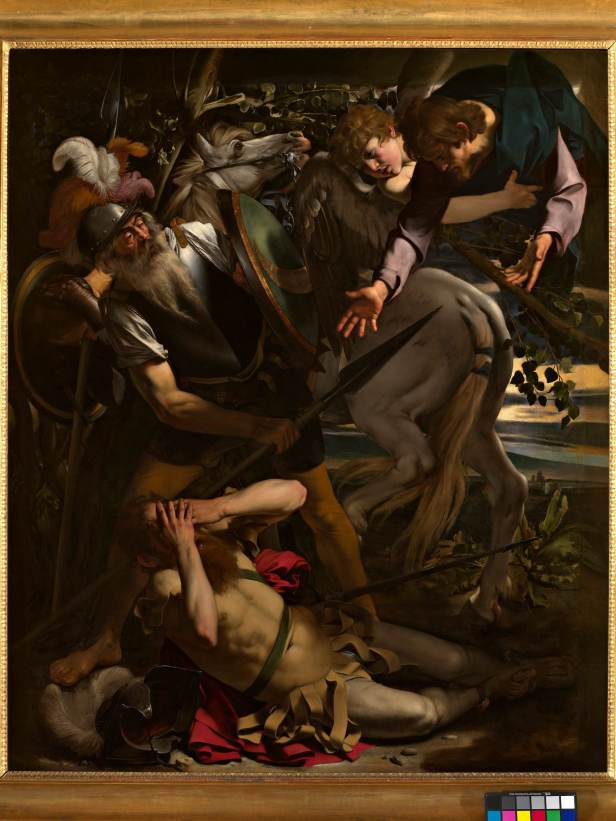 Nel 1600 il successo del pittore è sancito dall’incarico di dipingere due tavole per la cappella Cerasi in Santa Maria del Popolo: la Crocifissione di san Pietro e la Conversione di Saulo (Coll. Odescalchi), di cui è esposta in mostra la prima redazione, differente dalla versione finale sia per il supporto utilizzato, una tavola di legno cipresso di grandi dimensioni (237×189 cm), molto più preziosa della tela che per l’impianto iconografico, in questa prima versione infatti San Paolo è ritratto come un uomo anziano su cui Cristo irrompe in prima persona illuminandolo; nel secondo che si trova nella chiesa a Piazza del Popolo, è un giovane soldato caduto da cavallo perché accecato da una luce sfolgorante. Non vera la storia del rifiuto del quadro perché ritenuto inadeguato, piuttosto perché troppo grande e pesante per essere posizionato nella cappella.