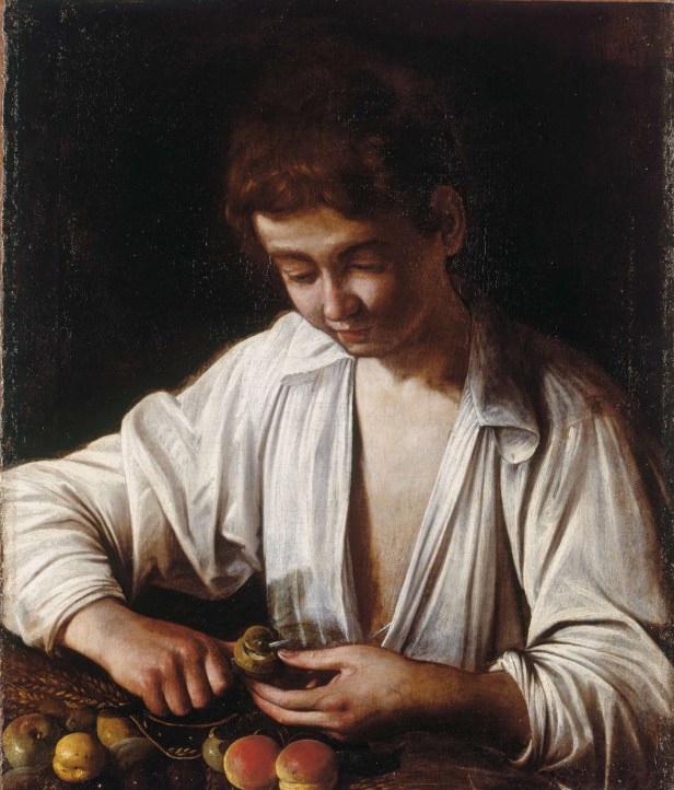 La prima sala, è dedicata al DEBUTTO ROMANO, le molte difficoltà affrontate, il transito nella bottega del noto e ammirato pittore Giuseppe Cesari, detto il Cavalier d’Arpino, dove venne impiegato per dipingere fiori e frutti. Il rapporto si deteriorerà nel giro di otto mesi, ma l’esperienza dei Naturalia lascerà tracce importanti e profonde in Caravaggio, sia nelle successive nature morte, come nelle primissime opere quale il Mondafrutto (The Royal Collection / HM King Charles III). Il dipinto, secondo Mancini, fu realizzato dal Merisi durante la sua permanenza presso Monsignor Pandolfo Pucci, un prelato originario di Recanati. La tela, o una sua copia (ne furono fatte molte), appartenne pure al letterato Cesare Crispolti che considerava l’opera, l’emblema della giovinezza simboleggiata dal frutto (un limoncello di Sorrento), che necessita di ammaestramento (sbucciata) per scartare la scorza amara lasciando emergere la dolcezza.