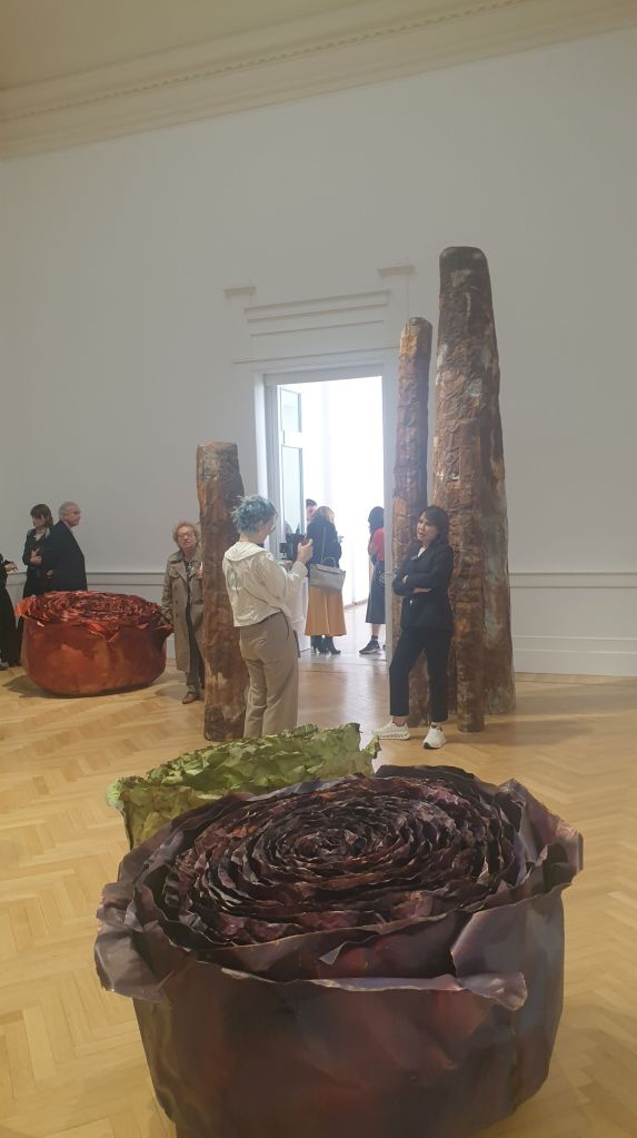 Nella ricostruzione di questo deserto rappresentato da sculture metalliche, letteralmente metallo ondulato recuperato e lavorato fino a renderlo stropicciato, sedimentato a rappresentare le rocce, le sedimentazioni utilizzando le ossidazioni proprie della materia utilizzata, affiancate a delle rose purpuree, violacee che richiamano le rose del deserto, formazioni sedimentarie comuni nei deserti, che vanno dall’arancione al giallo-ocra, aggregati di cristalli di gesso che prendono vita in certe condizioni climatiche. Eppure, le rose di Francesca Leone con quei colori ricordano anche il risveglio dal sonno dell’ultimo mattino, quando il sogno e la realtà si confondono e i ricordi fanno emergere nelle stanze della memoria le ombre lunghe di immagini sfocate eppure cariche di sostanza emotiva che come la natura permette il recupero e la rinascita. Il sottofondo dei rumori ferrigni, fragorosi o vivificanti come il vento e come lo zzz delle api, sono riprodotti nella composizione di Marco Turriziani e permettono la straniamento, l’immersione totale in uno spazio metafisico, nel quale la natura e i ricordi si fondono dando vita ad una bellezza nuova, ad una rinascita corroborante.