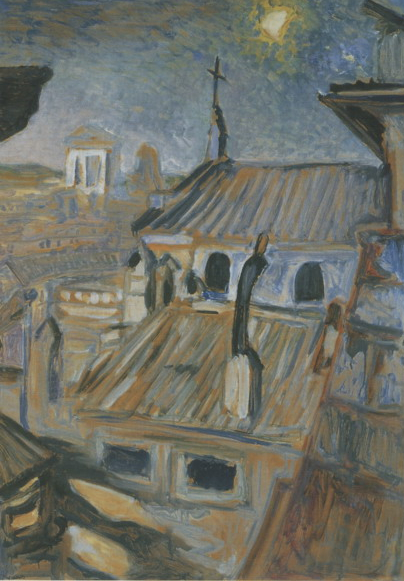 La seconda sezione Da Torino a Roma: suggestioni, aperture e nuove ricerche si passa dal periodo torinese, in cui il fascino discreto della loro città si rivela nei ritratti di familiari e amici, nelle nature morte e negli scorci cittadini realizzati dai due artisti (Tramonto con la Mole, del 1942, di Piero Martina), a quello romano caratterizzato dalla tragica incombenza della guerra e dai continui spostamenti dei due artisti. Costretto al confino in Lucania, dopo diversi arresti tra il 1934 e il 1938, Carlo Levi vivrà come un nomade tra Francia e Italia nell’intento di evitare la persecuzione della polizia fascista, le leggi razziali e la deportazione. Gli incontri con Martina non si interrompono, nel 1942 le loro case a Torino verranno distrutte durante un bombardamento, sono dello stesso anno i Ritratti che l’uno fa dell’altro. Martina utilizza un linguaggio più contemporaneo con un uso del colore più fermo e studiato, prendendo le distanze dalle atmosfere intimiste e delicate dei primi lavori (Ragazza al clavicembalo, 1940; Rose e conchiglie, 1942). Levi, invece, a partire dal suo confino lucano, si orienta verso i temi sociali, rappresenta la condizione di miseria dei contadini del sud Italia, abbandonando le trasparenze per concentrarsi su strutture robuste, dense e “ondose” che occupano e definiscono lo spazio percepito come mobile e trascorrente (Autoritratto con fornello, 1935 Tetti di Roma, 1951).