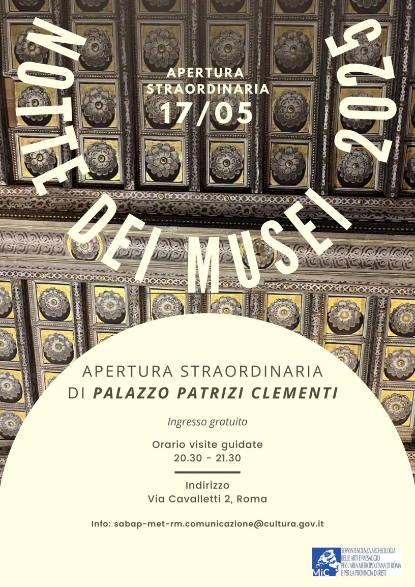Palazzo Patrizi Clementi, sede della Soprintendenza Archeologia, Belle Arti e Paesaggio per l’area metropolitana di Roma e per la provincia di Rieti, partecipa alla Notte Europea dei Musei 2025, l’importante manifestazione culturale, giunta alla sua ventesima edizione, cui il Ministero della Cultura aderisce, promossa dal Ministero della Cultura francese e patrocinata dall’UNESCO, dal Consiglio d’Europa e dall’ICOM. Il Palazzo, solitamente chiuso al pubblico, apre le sue secentesche sale ai visitatori per una serata all’insegna dell’arte e della bellezza.