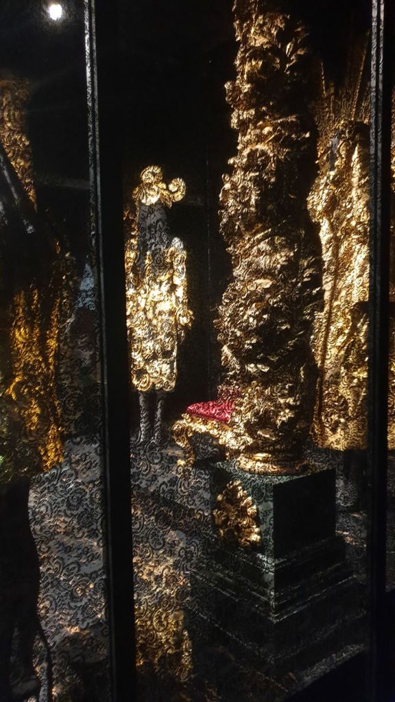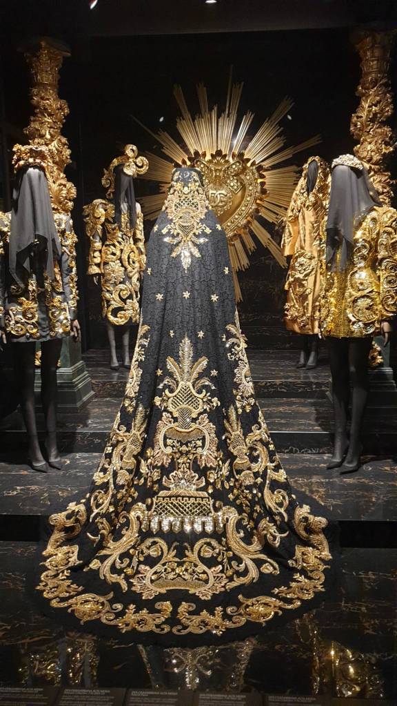 Bellissima anche la sala ideata come l’interno di un santuario, il pizzo è inserito anche nell’architettura in vetro dello spazio dove si trovano gli abiti, tra cui una bellissima mantella ricamata a fili d’oro. Al centro di un altare laico un cuore sacro ha inscritte le iniziali D&G.