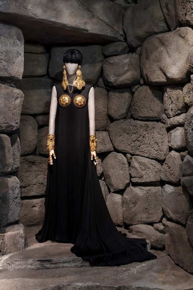 Nella grande sala d’accoglienza del Palazzo sono raccolti abiti maschili e femminili con i ritratti di chi li ha ispirati o indossati esposti su una torre per poterne ammirare le stoffe con ricamo a piccolo punto che ritrae paesaggi, i ricami ad intaglio, le trasparenze, le lavorazioni a cesto che sembrano pesanti ma che sono una carezza essendo realizzate in seta. Abiti ma non solo, scarpe, borse, gioielli, addirittura il taglio di diamante voluto e pensato dal marchio e poi occhiali pensati come maschere piene di lustrini e piume, accessori per acconciature.