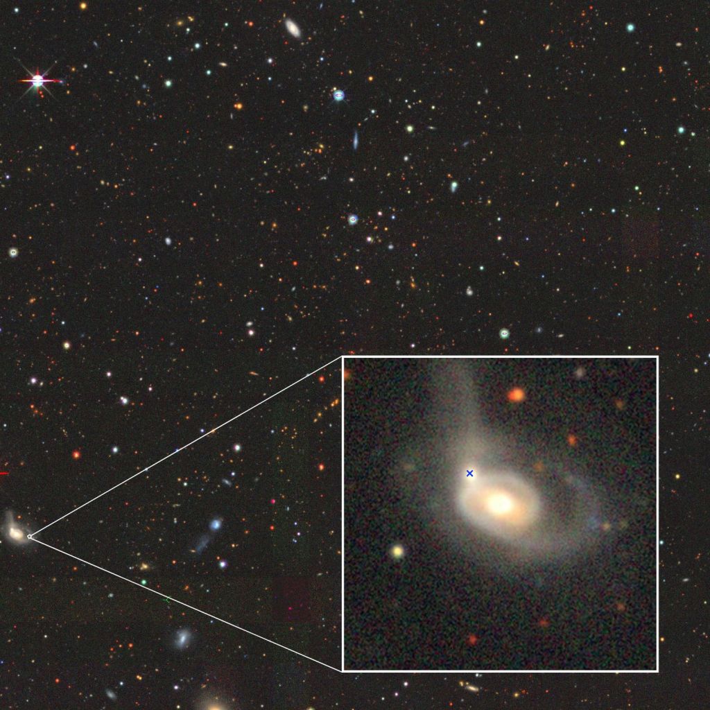Figura 1: Immagine dal Legacy Survey DR10 del campo di AT 2022wtn. Nel riquadro viene mostrato il transiente che si è verificato nel nucleo della galassia minore in interazione, indicata dalla croce blu. Sono ben visibili le code mareali, risultato dell’interazione gravitazionale e della fusione tra le due galassie. Crediti: Legacy Surveys / D. Lang (Perimeter Institute) / INAF / F. Onori