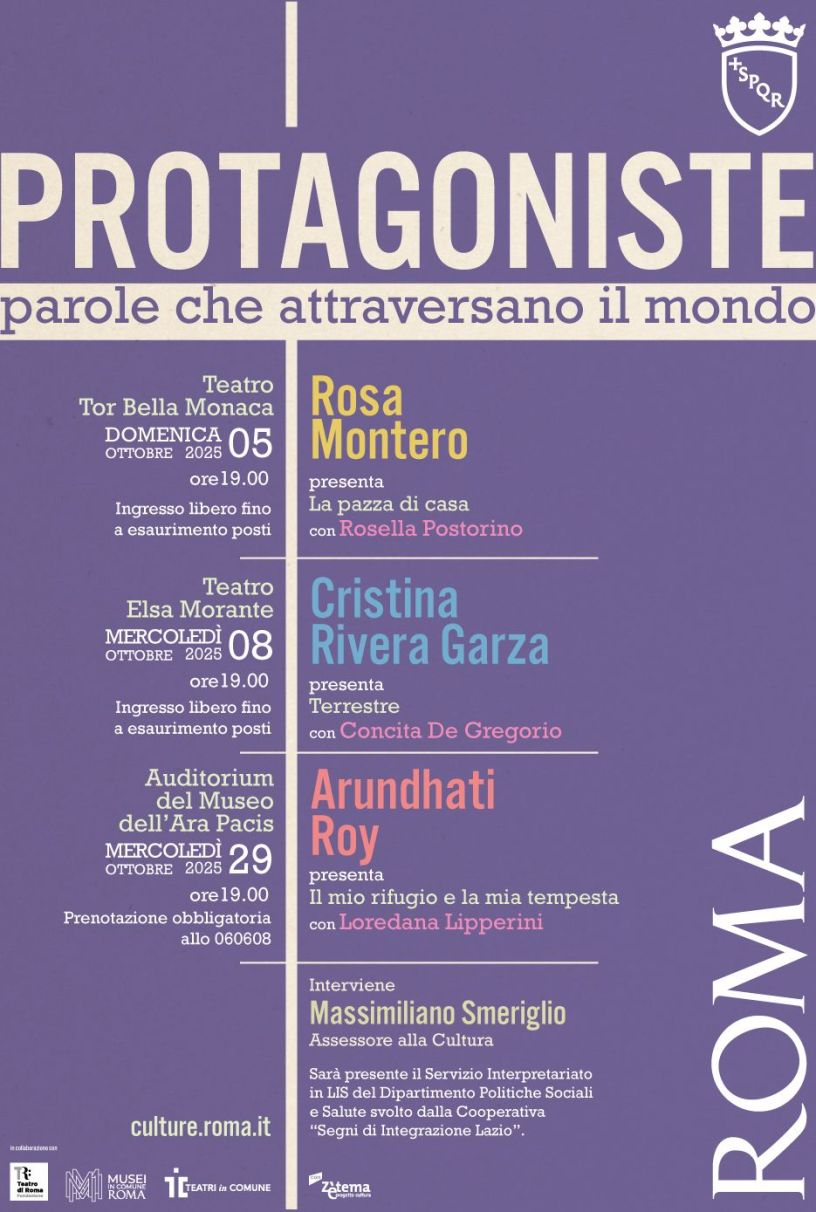 PROTAGONISTE – Parole che attraversano il mondo è promosso dall’Assessorato alla Cultura di Roma Capitale con il coordinamento del Dipartimento Attività Culturali e in collaborazione con Fondazione Teatro di Roma, Sovrintendenza Capitolina ai Beni Culturali e TiC – Teatri in Comune. Supporto organizzativo di Zètema Progetto Cultura.