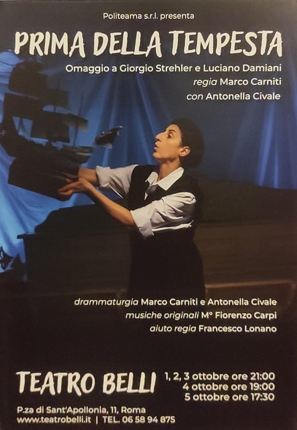 “Prima della Tempesta” è uno spettacolo teatrale che rende omaggio a due figure iconiche del teatro italiano del ‘900: il regista Giorgio Strehler e lo scenografo Luciano Damiani. Lo spettacolo, con drammaturgia di Marco Carniti e Antonella Civale e regia di Marco Carniti, si propone di esplorare il valore dell’arte e della vita al di fuori delle logiche di mercato, prendendo spunto dai materiali di lavoro per la celebre produzione de “La Tempesta” di Shakespeare messa in scena da Strehler nel 1978 al Teatro Lirico di Milano.