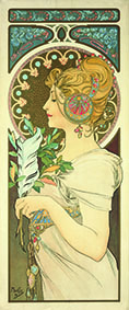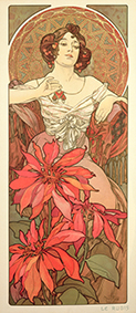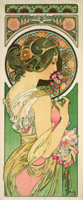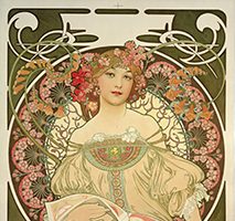 Alphonse Mucha (Ivančice, 24 luglio 1860 – Praga, 14 luglio 1939) artista ceco, ha alla base della sua opera la ricerca di un’armonia tra natura, arte e figura femminile, utilizzando linee fluide, motivi floreali e composizioni decorate secondo uno stile d’influenza bizantina e asiatica. Trova ispirazione nella natura, utilizzando le forme organiche e armoniose per creare motivi floreali, ghirlande, viticci e arabeschi che circondano le sue figure. Le donne che ritrae sono iconiche, raffigurate come belle, sensuali, voluttuose, soprattutto consapevoli, emancipate, il cui sguardo diretto e forte simboleggia libertà, dignità e modernità. Un’iconografia femminile che rappresenta un nuovo ideale, segnando l’inizio di un’epoca di emancipazione, ed ecco spiegato il motivo per cui le aziende dell’epoca scelsero i suoi disegni per le loro campagne pubblicitarie.