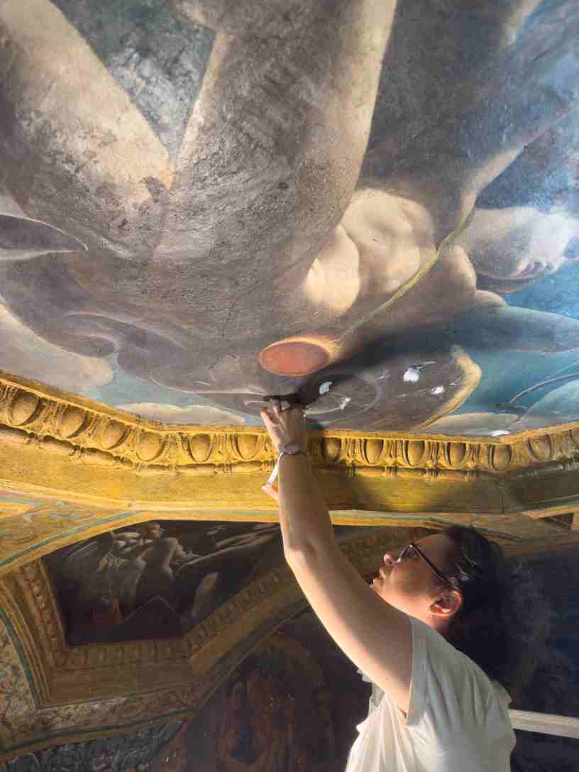 Il restauro, eseguito con maestria da Marica Negri e Isotta Lorenzini, ha coinvolto diverse tipologie di superfici decorative: dai dipinti a olio con le scene della storia di Amore e Psiche, alla struttura cassettonata con elementi vegetali su base dorata, fino al modellato in stucco e agli affreschi delle lunette. Ogni dettaglio è stato oggetto di attenta cura e precisione.