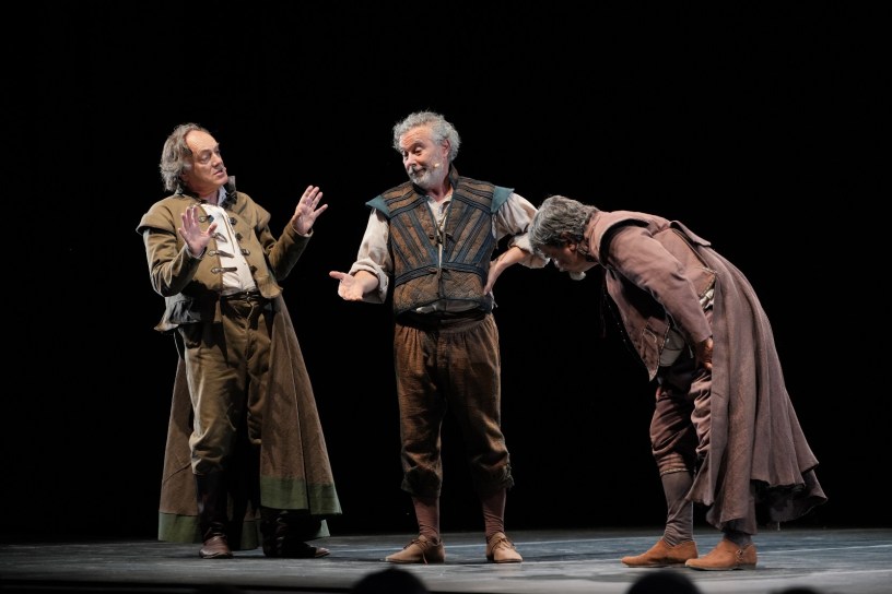 Sul palco, Francesco Pannofino e Francesco Acquaroli, una coppia irresistibile: due clown/avventurieri smarriti nel labirinto del destino, in equilibrio instabile sulla corda tesa di situazioni assurde, ai loro occhi la vita sembra un gioco dai risultati sempre truccati. La loro intesa scenica, dai tempi comici perfetti e da un’ironia intelligente, restituisce al pubblico la dimensione umana e malinconica dei due personaggi: uomini comuni catapultati in una tragedia più grande di loro. Paolo Sassanelli, nel ruolo del Capocomico, aggiunge una teatralità esuberante, quasi circense, guidando la compagnia degli attori comici erranti, con carisma e contagiosa energia. L’allestimento di Luigi Ferrigno, trasforma il palcoscenico in una grande macchina scenica, un marchingegno medievale che richiama i carri della Commedia dell’Arte e il doppio palco elisabettiano. La scenografia, mutevole e dinamica, è in continua trasformazione – teatro, castello, nave – dando rilievo alla natura metateatrale della pièce, un teatro nel teatro, nel quale la vita si specchia sul palcoscenico, recitando senza conoscere il copione. Anche i costumi, volutamente d’epoca e adattabili o alterabili, amplificano la dimensione di gioco e d’illusione.
