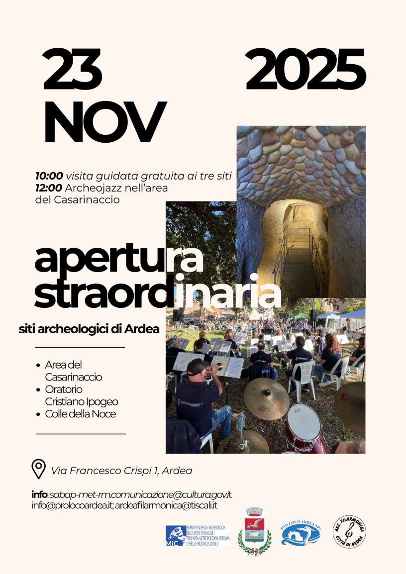 L’area archeologica del Casarinaccio, l’area archeologica di Colle della Noce e l’oratorio cristiano ipogeo, in collaborazione con la Pro Loco di Ardea e l’Accademia Filarmonica di Ardea.