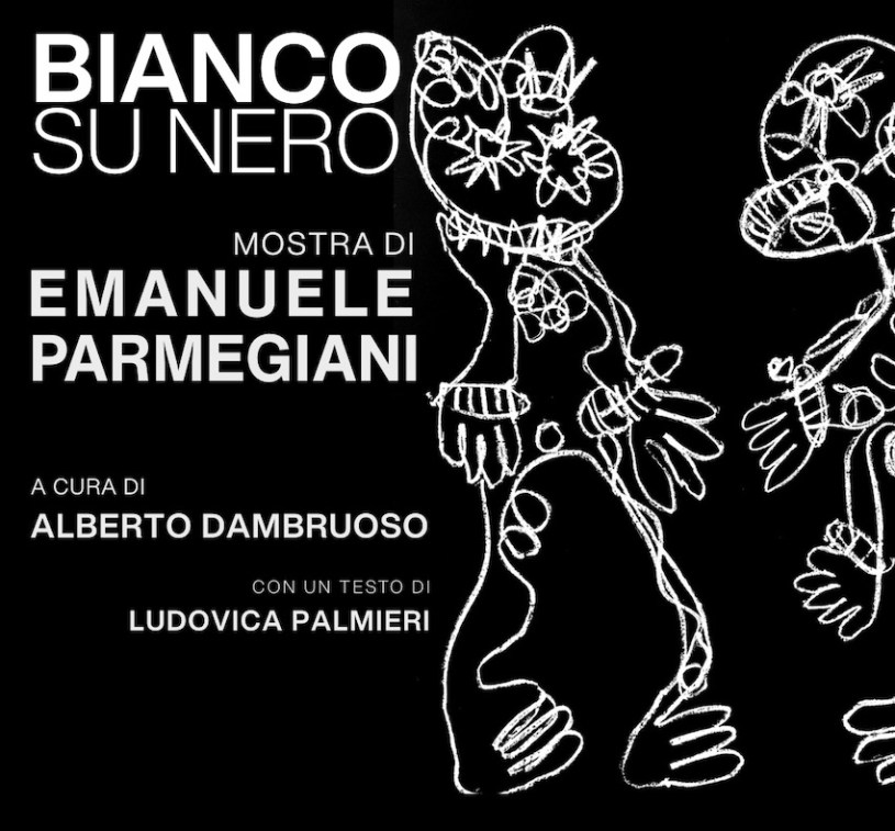 «C’è un nero che non è assenza, ma spazio potenziale.», scrive Ludovica Palmieri nel testo critico, «Le tele di Emanuele Parmegianinascono da lì. Superfici scure che evocano lavagne, territori aperti alla possibilità, dove il bianco del segno diventa gesto rivelatore, traccia di un pensiero che si manifesta nell’atto stesso del fare. Bianco su nero, come gessetto che incide, graffia e riscrive, Parmegiani lavora guidato da un’urgenza visivache non ammette esitazioni. Ogni tratto è un’impronta dell’inconscio, una scia emotiva che affiora tra il mostruoso, il grottesco e l’ironico, tra la spontaneità e la progettualità, tra la necessità di esprimersi e la consapevolezza del rischio che ogni atto creativo comporta. […] In Bianco su nero l’artista rinuncia al colore per tornare all’essenza della pittura: gesto, linea, secondo un ritmo interiore che prende corpo sulla superficie. Le sue tele sono una sorta di lavagne mentali, territori sospesi in cui la mano agisce come un sismografo dell’inconscio, tracciando percorsi che diventano rivelazioni. Non c’è distinzione tra disegno e pittura: le opere vivono in una dimensione intermedia, in cui il segno diventa immagine e l’immagine si dissolve di nuovo nel segno. Tutto si gioca nella vibrazione tra bianco e nero, nella dialettica essenziale tra luce e ombra, presenza e assenza, controllo e abbandono. Parmegiani costruisce così un linguaggio fatto di tensioni e di pause, di apparizioni improvvise e di vuoti che respirano. […] Bianco su nero è dunque una riflessione sulla pittura come atto originario, come necessità più che come scelta estetica. La superficie nera, densa e silenziosa, accoglie il bianco come un atto di rivelazione, un gesto di emersione, quasi una scrittura istintiva che affiora dal buio.»