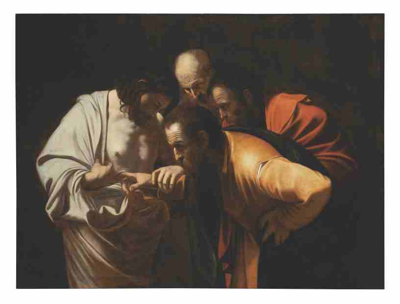 Posto d’onore, nella rassegna, l’omaggio a Caravaggio con l’esposizione dell’esemplare de L’Incredulità di San Tommaso (1600-1601), uno dei casi attributivi più complessi, rispetto alle versioni più conosciute sembra una versione più tarda, esposta già in collezione Gracco Muratti a Trieste, dal 2019 è di proprietà austriaca, oggi si trova a Firenze. Come ha sottolineato Bertuzzi: «.. Questa versione probabilmente risale proprio al 1606. L’opera è particolarissima, non soltanto per il grande successo che ha avuto, ma anche per la sua composizione, con la peculiarità delle quattro teste al centro del quadro. Queste disegnano una croce, e la croce ci rimanda al Cristo, e Cristo che con la sua mano accompagna la mano di San Tommaso. Uno dei vertici della teologia, se così possiamo chiamarla, che costruisce la poetica del Maestro».