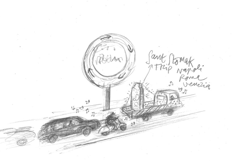 La seconda convocatoria a base di caffè e cornetto è prevista dalle 8:30 alle 9:30 al Bar Gianicolo, davanti a Porta San Pancrazio (antica Porta Aurelia). La chiamata pubblica è aperta a tutti i cittadini e conducenti romani, associazioni motoristiche, moto club, vespa club, tassisti, trattori e a tutti i mezzi di locomozione che desiderino unirsi alla carovana. Dalle 10:00h alle 11:30h GIRO URBANO. Carovana su ruote. Durante il GIRO URBANO, San Stomak, nella sua anima dialogica e dualista — che connette il sacro e il profano, la tradizione e le necessità contemporanee — invita il nostro sguardo a vagare in nuovi panorami e guida il nostro cammino verso le viscere della città, dentro le mura, in una processione che, per la sua concezione motorizzata, ricorda gli autobus turistici che in alta stagione occupano in lunghe file le strade cittadine;