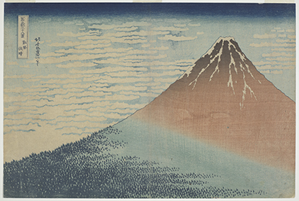 Il maggior pregio di Hokusai fu la capacità di costruire lo spazio con pochi tratti e pennellate di colore, qualità che lo rese celebre anche oltre i confini del Giappone, soprattutto dopo l’apertura del paese ai rapporti con l’Occidente. La sua particolarità risiede nel modo in cui organizza lo spazio tra natura e gesto umano. Le immagini, come il Monte Fuji o La Grande Onda, cambiano in base alla distanza dell’osservatore. Le figure umane si mimetizzano nell’architettura o nel paesaggio naturale, fondendosi con esso attraverso il colore. Avvicinandosi, l’occhio distingue progressivamente il disegno e la forma essenziale, tra una natura fluttuante e cangiante.
